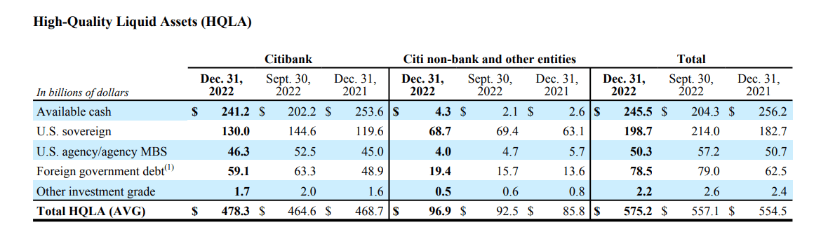 As can be seen above, Citi is highly liquid with $242 billion of cash on hand as well as securities in its HQLA portfolio. In addition, as disclosed in the 10-K, it has additional access to liquidity sources above and beyond the HQLA: