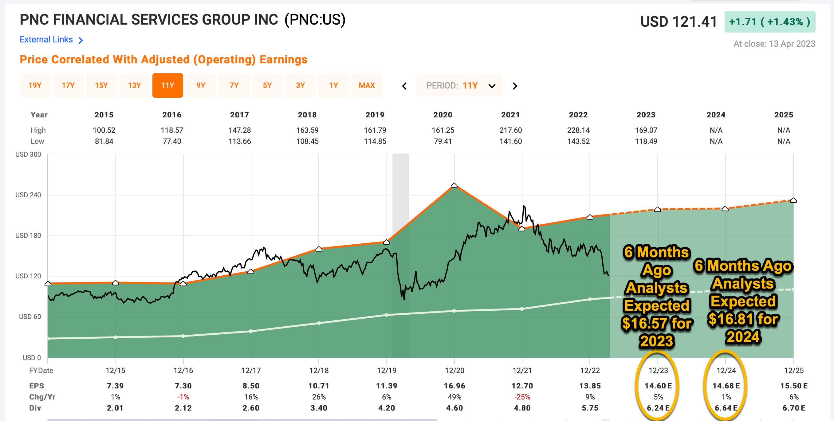 The headline after this quarter’s earnings was that PNC beat by $0.34. Another news outlet had them beating estimates by about $0.32, so the general consensus was pretty close in terms of quarterly expectations. For this year, Seeking Alpha’s consensus was $14.42 per share.