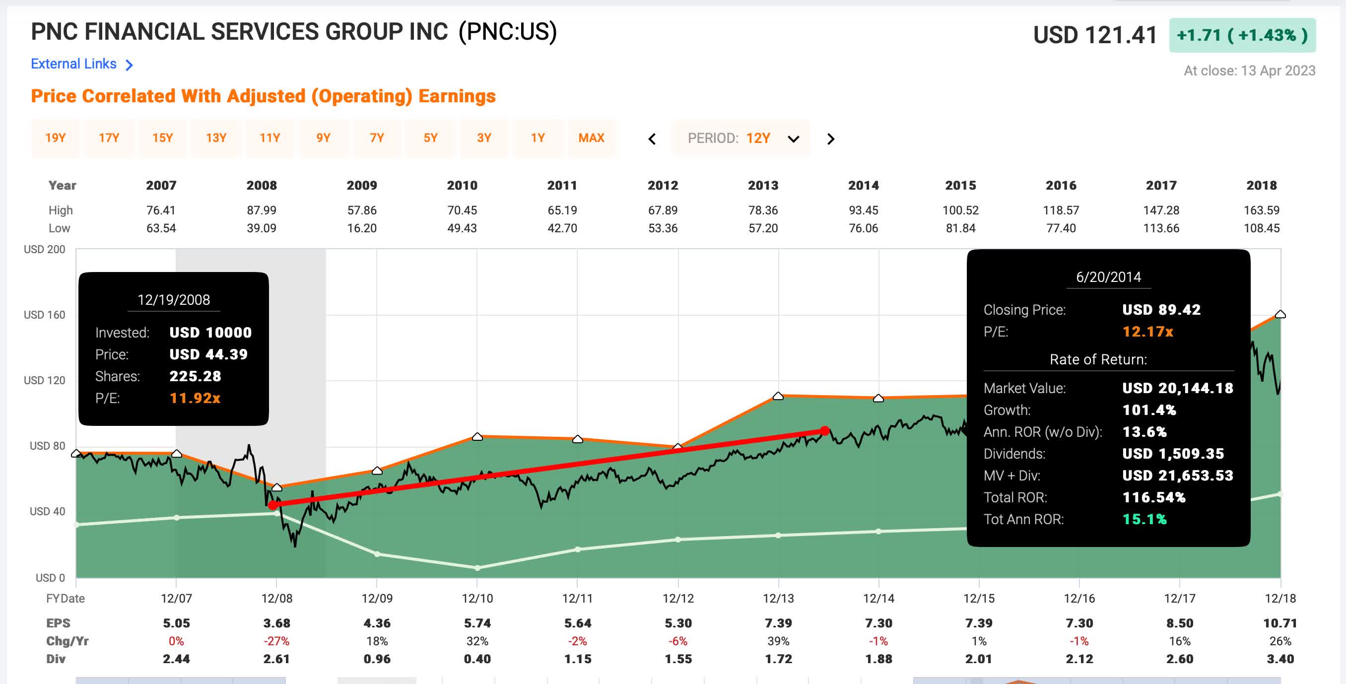 Buying PNC at that point would have produced pretty good absolute returns over these 6.5 years with a +116% total return. But that actually would have underperformed the S&P 500 over this same time period.