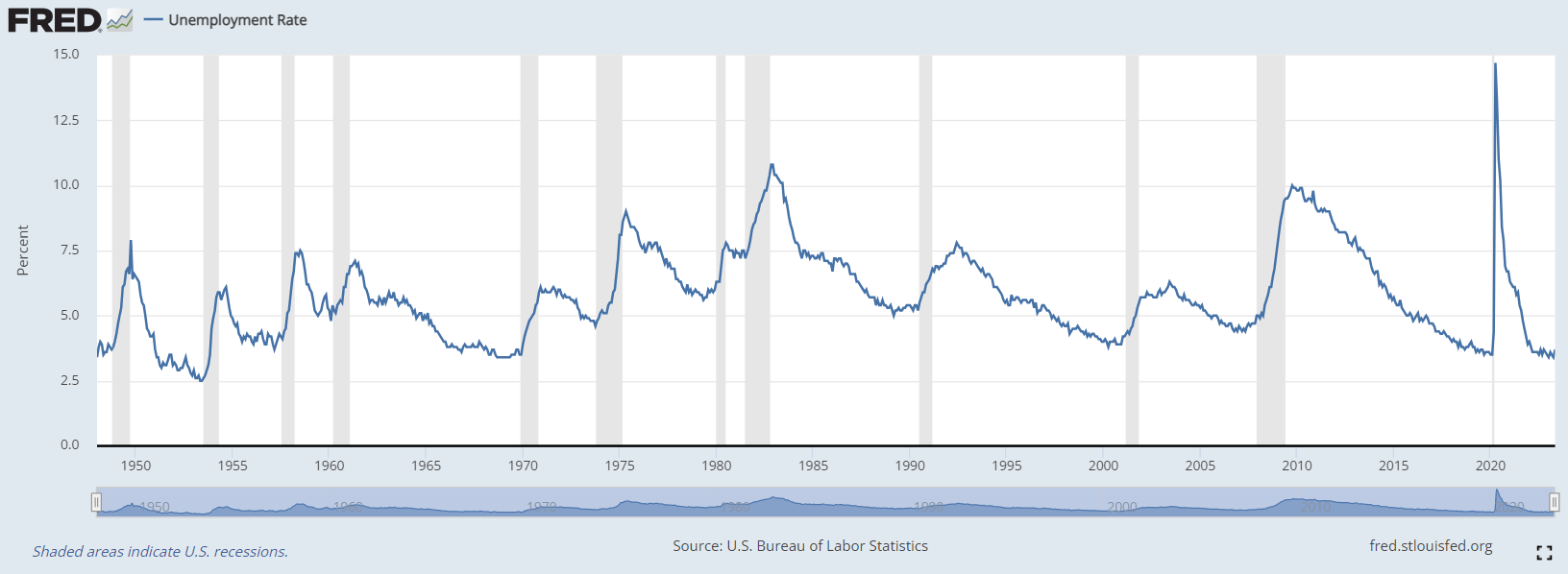 Figure 1: U.S. unemployment rate [UNRATE], U.S. Bureau of Labor Statistics (retrieved from FRED, Federal Reserve Bank of St. Louis)