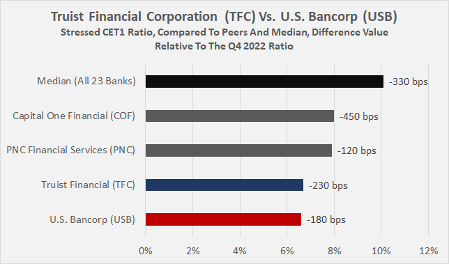 However, when considered in the context of a more or less comparable peer group (PNC Financial Services (PNC), Capital One Financial (COF)), they did not perform so badly and are still well above the regulatory minimum. Looking at the decline in CET1 from an actual year-end 2022 perspective, U.S. Bancorp and Truist are among the better performers, with declines of 180 basis points (ranked 8th) and 230 basis points (ranked 10th), respectively. To give you an idea of the range, Deutsche Bank USA (DB) was by far the worst performer, with a decline of 870 basis points from the unstressed level, and Bank of New York Mellon (BK) saw its CET1 ratio increase by 150 basis points under stress.